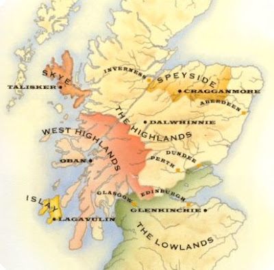 Existeixen quatre grans àrees de producció de Whisky de Malta: Els Highlands, els Highland-Speyside, on es troben la majoria de les destil·leries, els Lowlands, que són els més suaus; i els produïts a l'illa d'Islay, que sempre genera grans passions a favor i en contra.